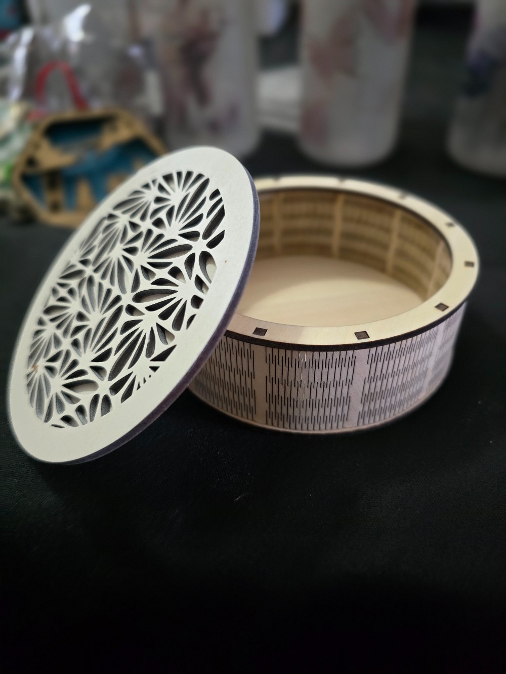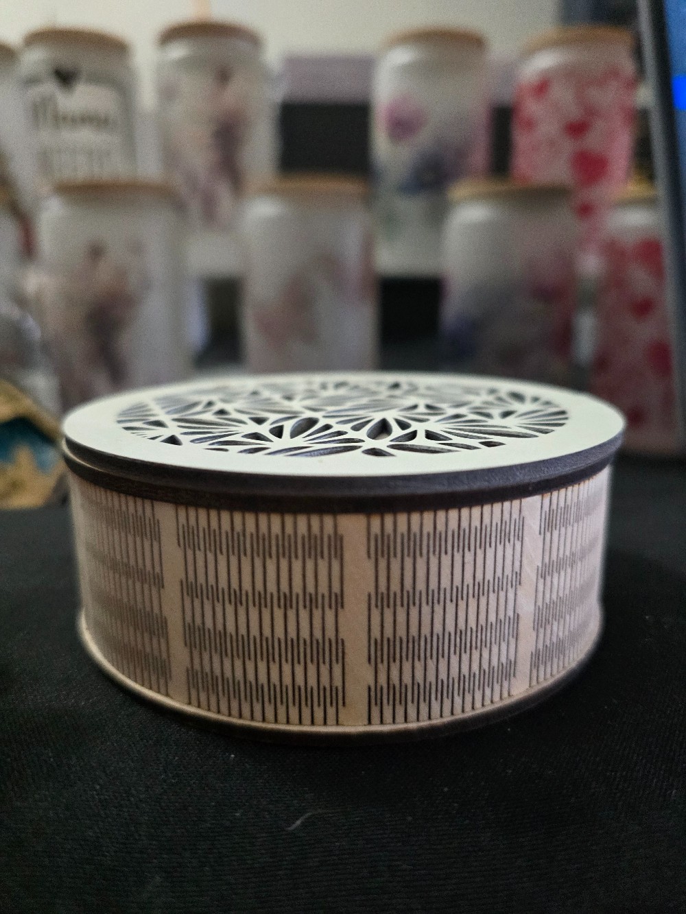 4 inch laser cut wooden container. Can be used as a trinket or jewelry box, or whatever your heart desires!