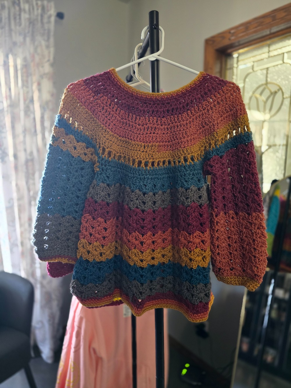 Hand crocheted with love for the ones you love! This one of a kind crocheted sweater is perfect for the autumn weather.