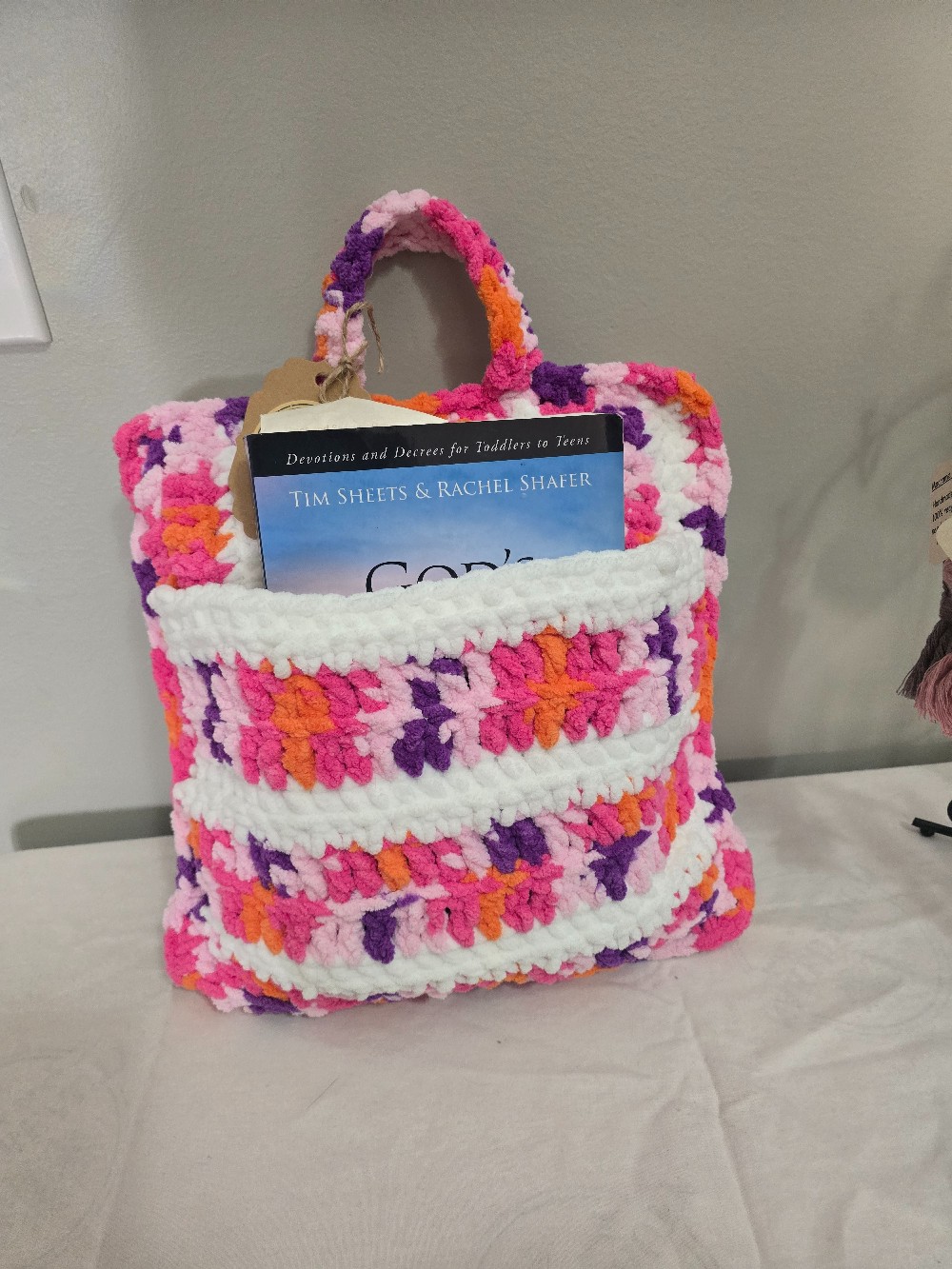 A hand crocheted book pillow great for traveling and storing your favoueite reads! Magazine/book not included.