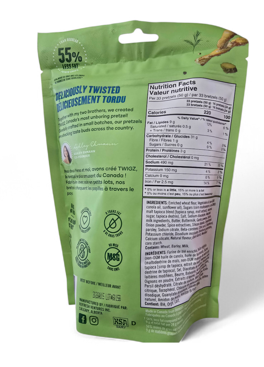 TWIGZ Zesty Dill Pickle pretzels are as far from the standard pretzel as you can get. Lovingly crafted, carefully rolled and seasoned with dill pickle and spices, then baked.